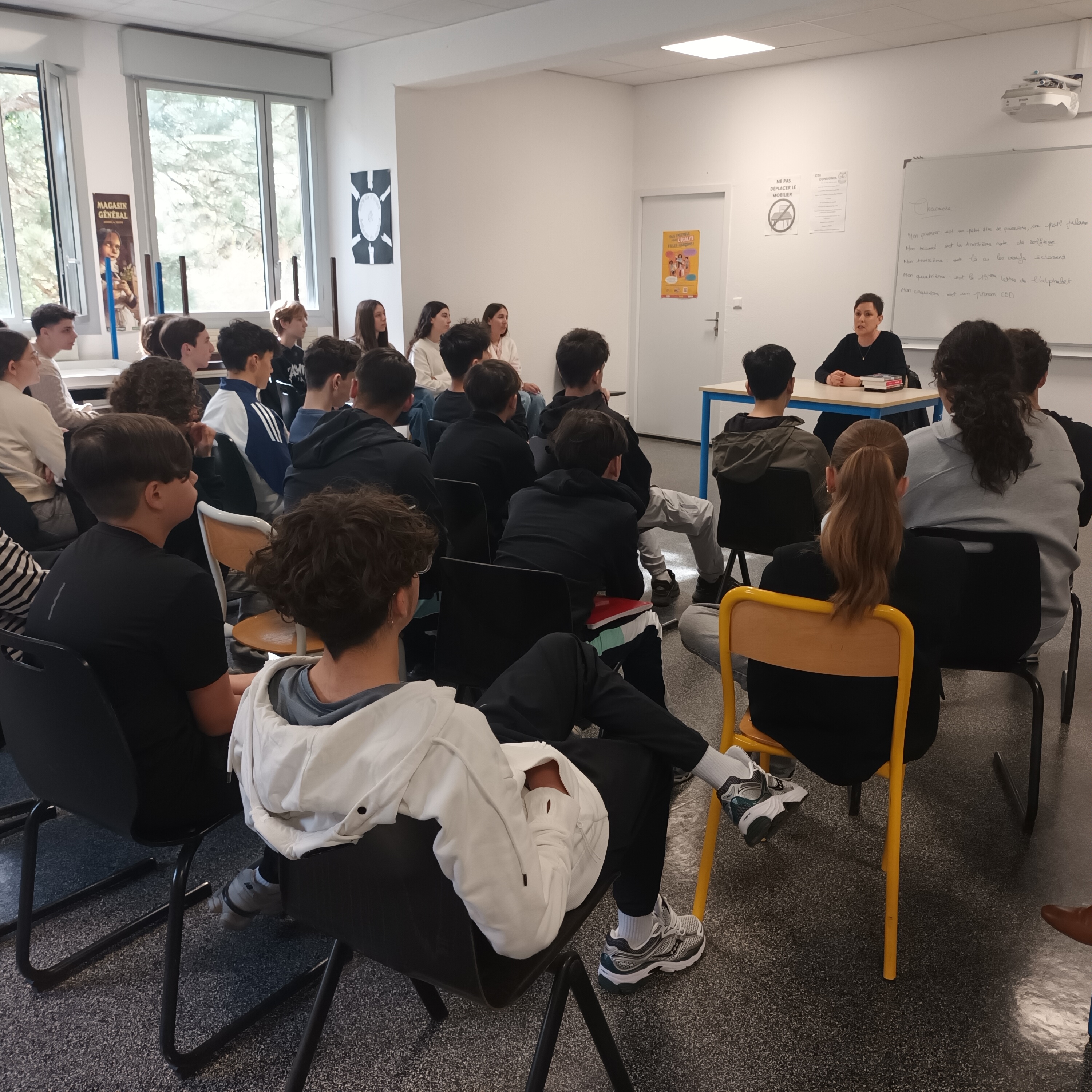 Ce jeudi 12 mars, les élèves de 3eD ont eu la chance d'accueillir Mme Catherine Cuenca, auteure de romans historiques pour la jeunesse. Grâce au projet Jeunes en Librairie, les élèves ont pu lui poser des questions sur son Roman Celle qui voulait conduire le tram qu'ils ont étudié en classe et ils ont eu le privilège d'avoir des informations sur son nouveau roman à paraître prochainement Emilienne Moreau, une héroïne de guerre. L'auteure leur a même lu en avant première un extrait de cet ouvrage. Un grand merci à elle pour sa gentillesse et sa disponibilité.